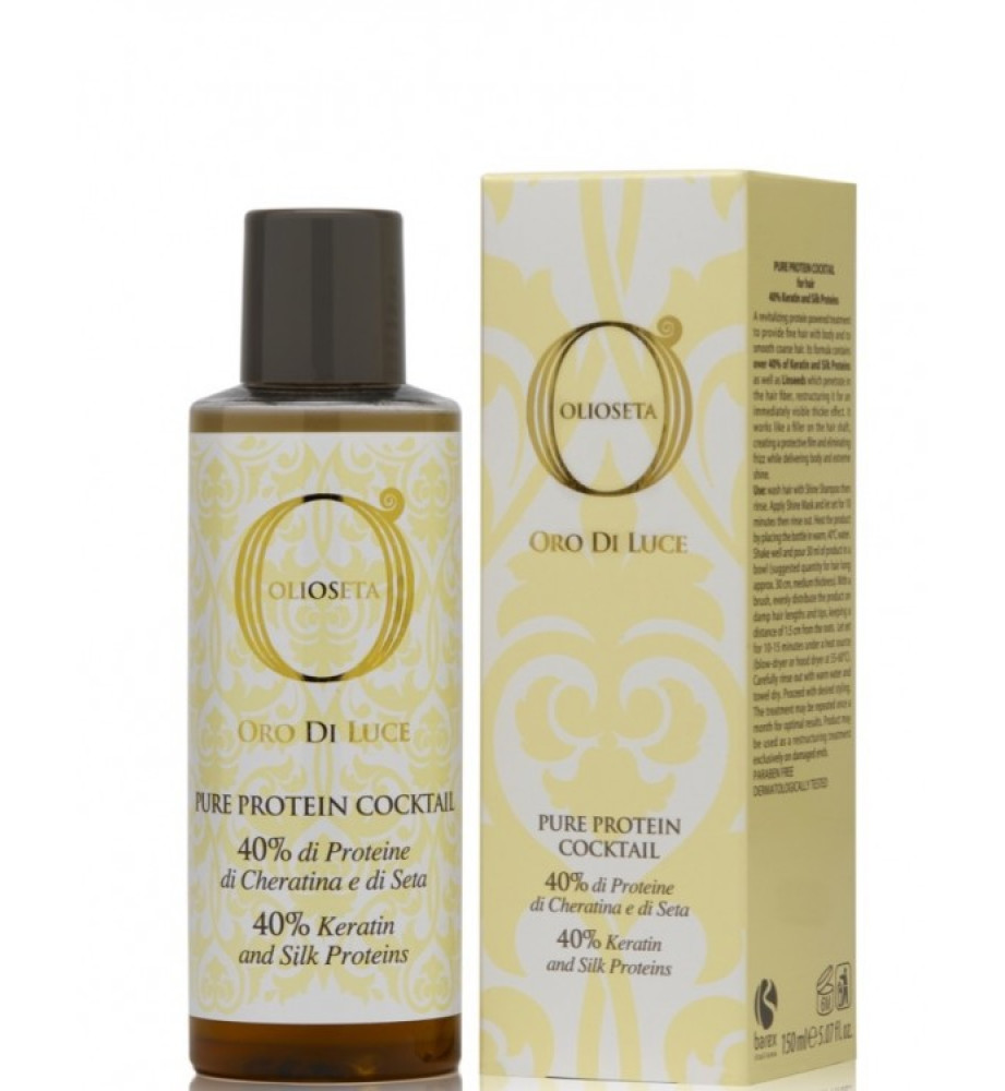 Протеиновый коктейль Olioseta Oro Di Luce Pure Protein Cocktail - это восстановление волос с помощью протеинов кератина и шелка, схожих по своей структуре с человеческим волосом. Он придает тонким волосам плотность, увеличивая их диаметр и делая волосы более объемными. Протеиновый коктейль действует как наполнитель для волос - создает на их поверхности защитную пленку, устраняет завитки, омолаживает структуру волос и придает здоровый блеск.