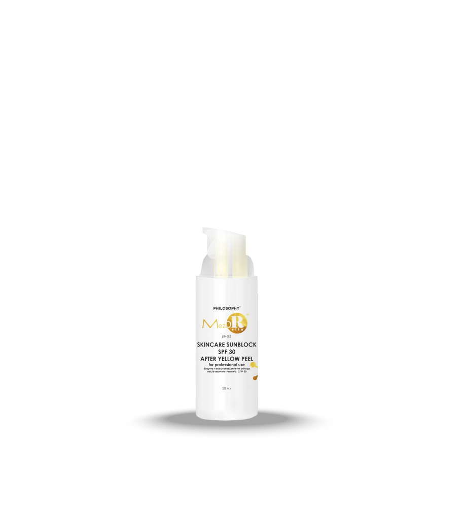 TM Mezoretin Scincare Sunblock SPF 30 After Yellow Peel – лучшее средство для защиты кожи от УФ-лучей после процедуры пилинга. Он обеспечивает как химическую, так и физическую защиту, питает кожу и способствует процессу реабилитации после пилинга. Этот продукт рекомендуется как для домашнего, так и для профессионального использования, его следует наносить повторно каждые три часа при активном воздействии солнечных лучей.